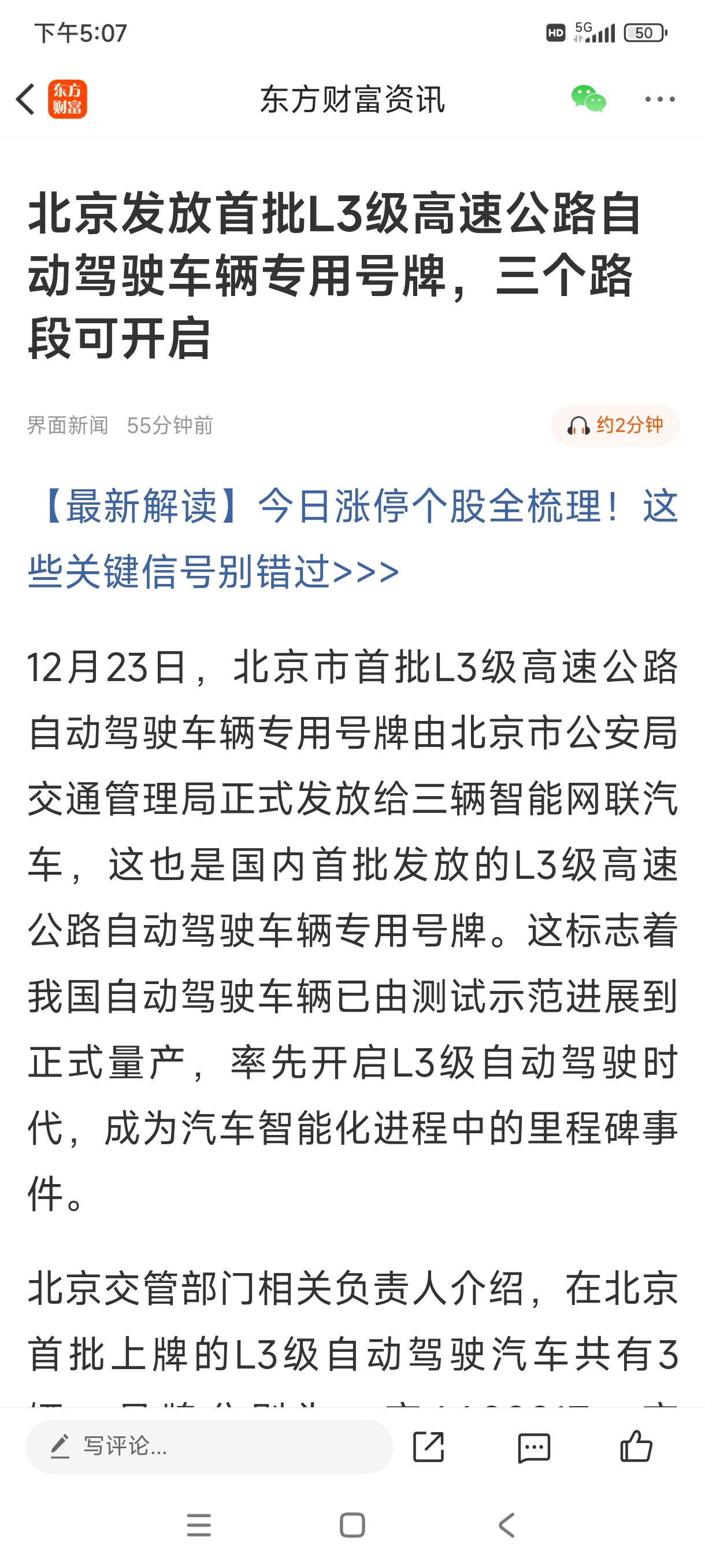 我估计今晚的新闻联播都会说l3自动驾驶的事,还会请专家解读,因为重庆和北京l3的自动驾驶车辆一旦开始大范围使用,以后自动驾驶遍地开花,这是一件大事,不可能不被大炒一番,明天可能掀起无人驾驶概念的涨停潮。