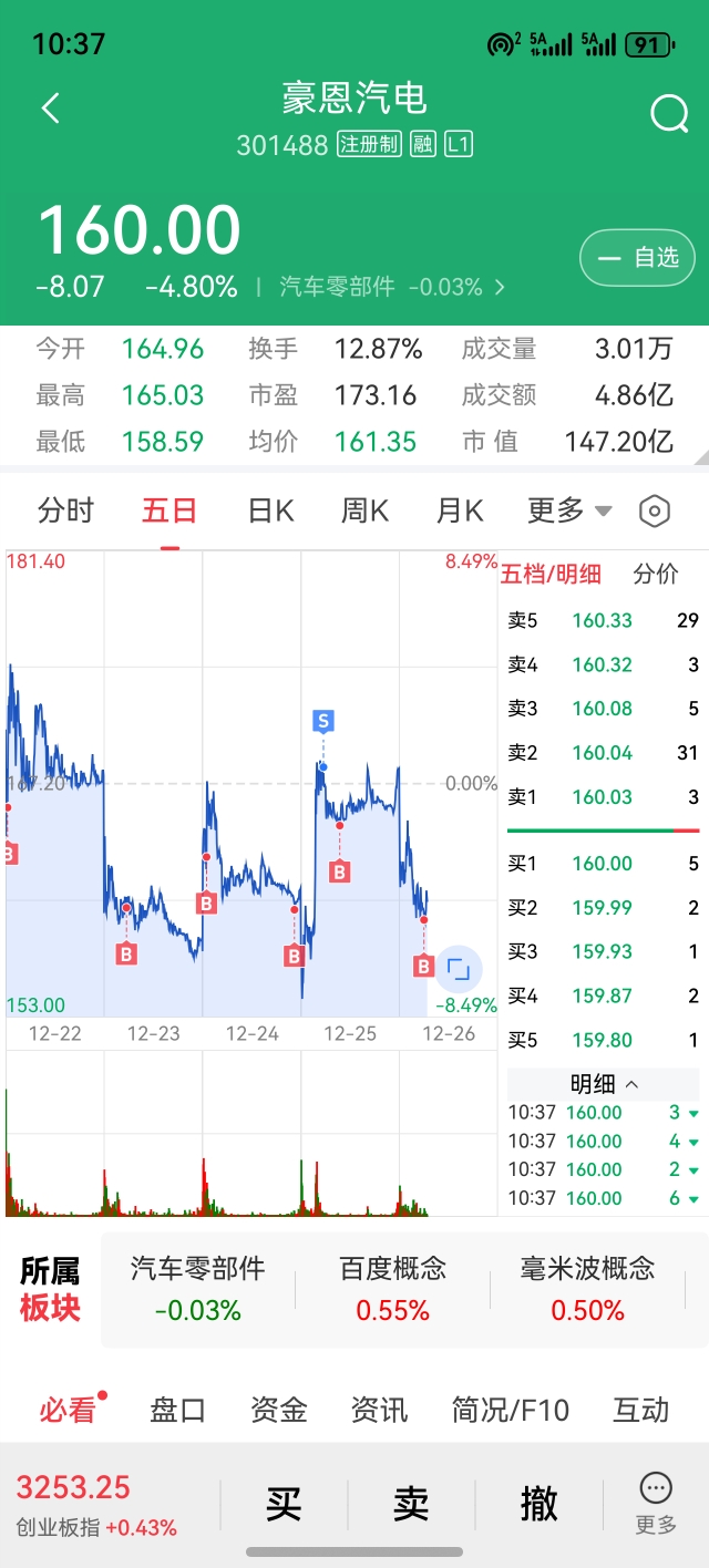 $豪恩汽电(SZ301488)$ 160附近吃饱喝足,今天实在是弱的不行,150以下再考虑加仓了