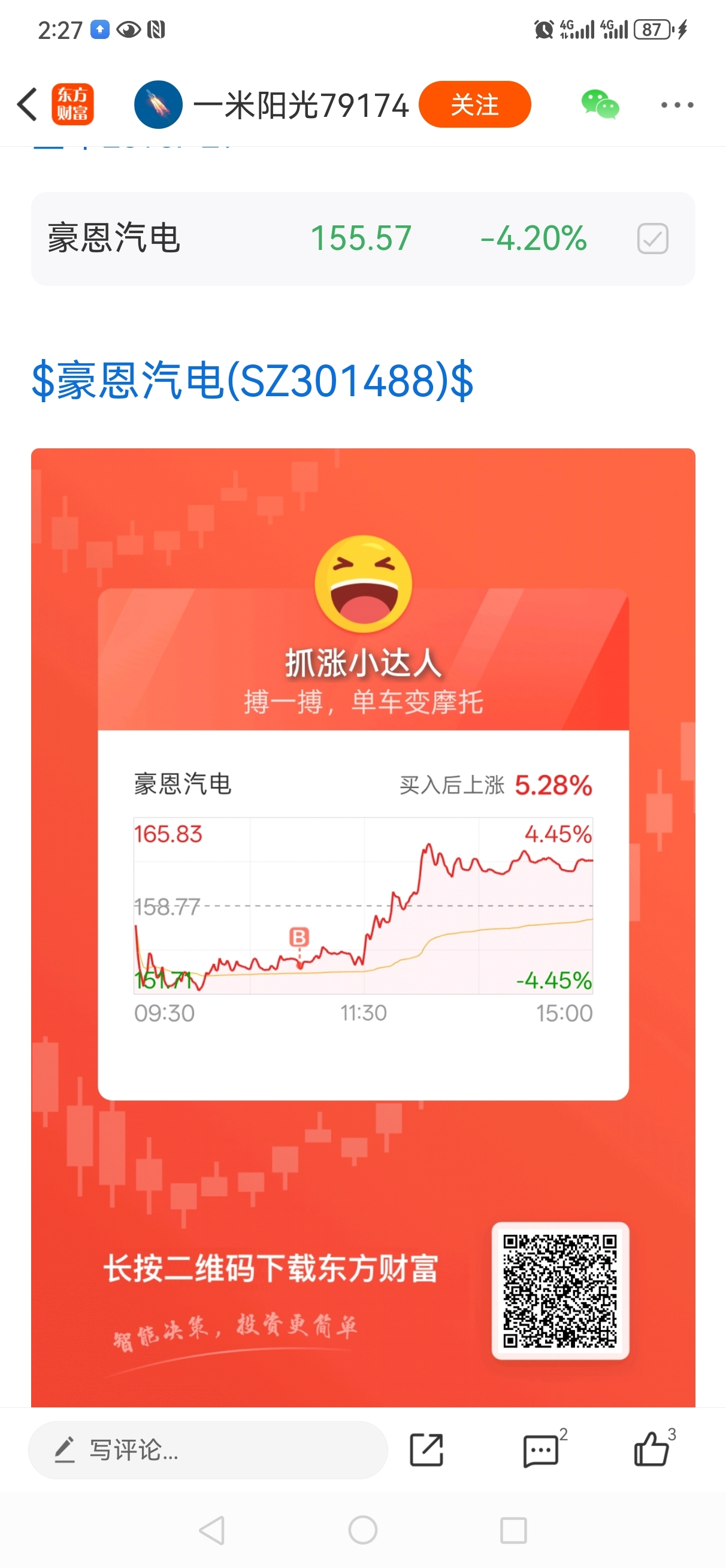 $豪恩汽电(SZ301488)$ 凡是这种晒单的,次日跌的概率大到你哭!!