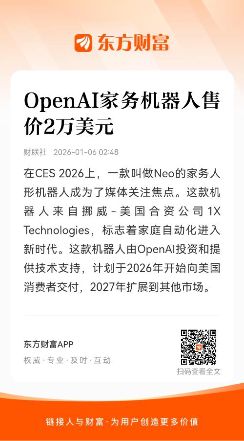 在CES 2026上,一款叫做Neo的家务人形机器人成为了媒体关注焦点。这款机器人来自挪威-美国合资公司1X Technologies,标志着家庭自动化进入新时代。这款机器人由OpenAI投资和提供技术支持,计划于2026年开始向美国消费者交付,2027年扩展到其他市场。
