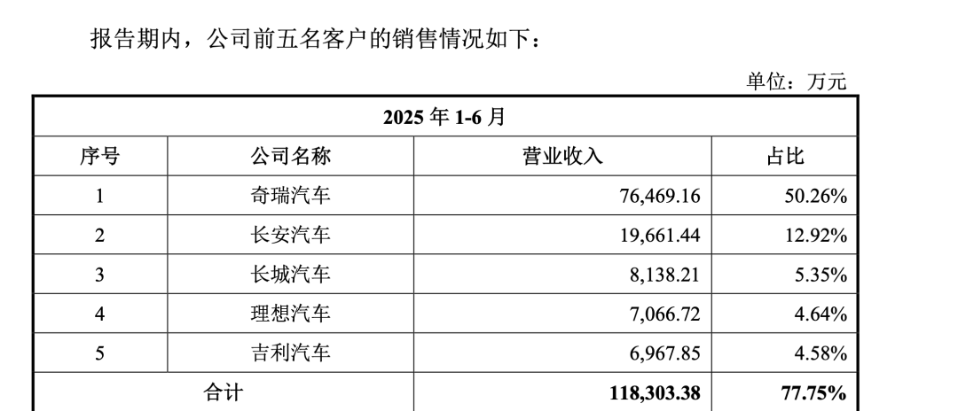 招股书中公布的埃泰克前五名客户销售情况,2022年至2025年上半年,奇瑞汽车对公司的营业收入占比由27.6%上升至50.26%,所占应收账款比例则由32.51%提升至55.94%。