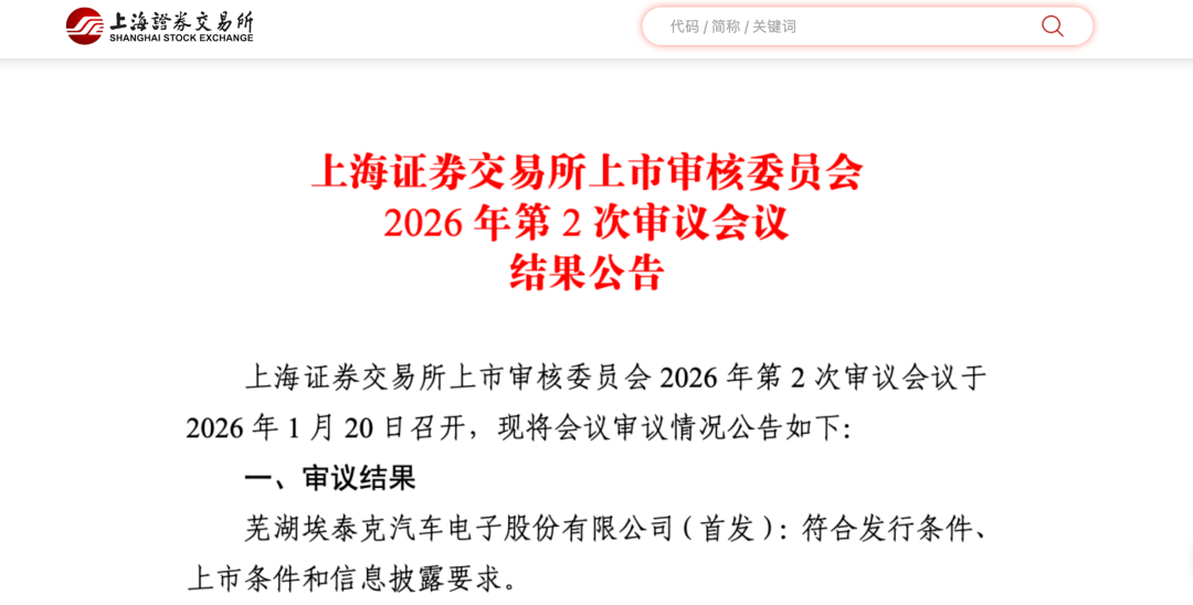 1月21日,上证报记者从上交所官网获悉,上交所上市审核委员会1月20日召开2026年第2次审议会议,芜湖埃泰克汽车电子股份有限公司(以下简称“埃泰克”)沪市主板首发上市申请获审议通过。汽车电子领域在资本市场将再添“新军”。