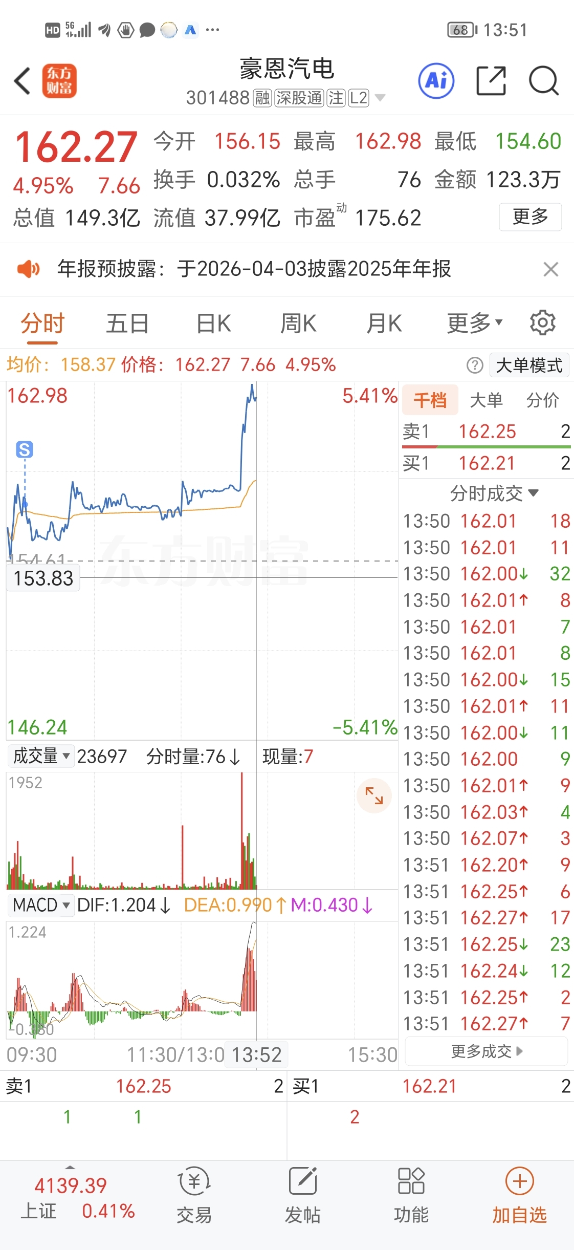 $豪恩汽电(SZ301488)$ 这个票前几天大涨20个点那天我是刚卖了他就大涨,这次虽然没有涨太多。但是也是卖完就拉起来。