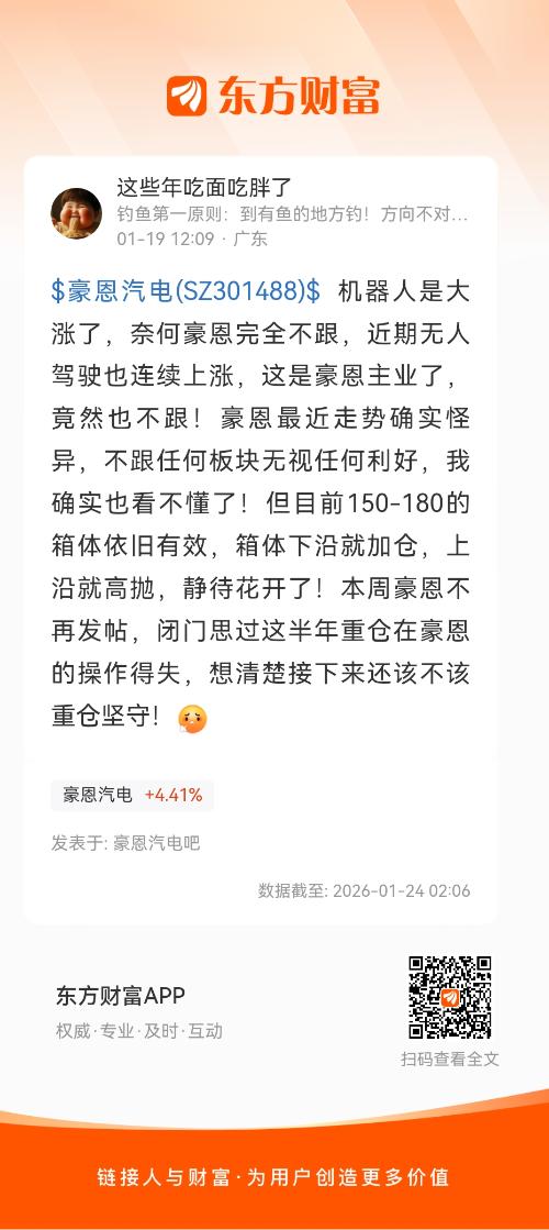 $豪恩汽电(SZ301488)$ 机器人是大涨了,奈何豪恩完全不跟,近期无人驾驶也连续上涨,这是豪恩主业了,竟然也不跟!豪恩最近走势确实怪异,不跟任何板块无视任何利好,我确实也看不懂了!但目前150-180的箱体依旧有效,箱体下沿就加仓,上沿就高抛,静待花开了!本周豪恩不再发帖,闭门思过这半年重仓在豪恩的操作得失,想清楚接下来还该不该重仓坚守!