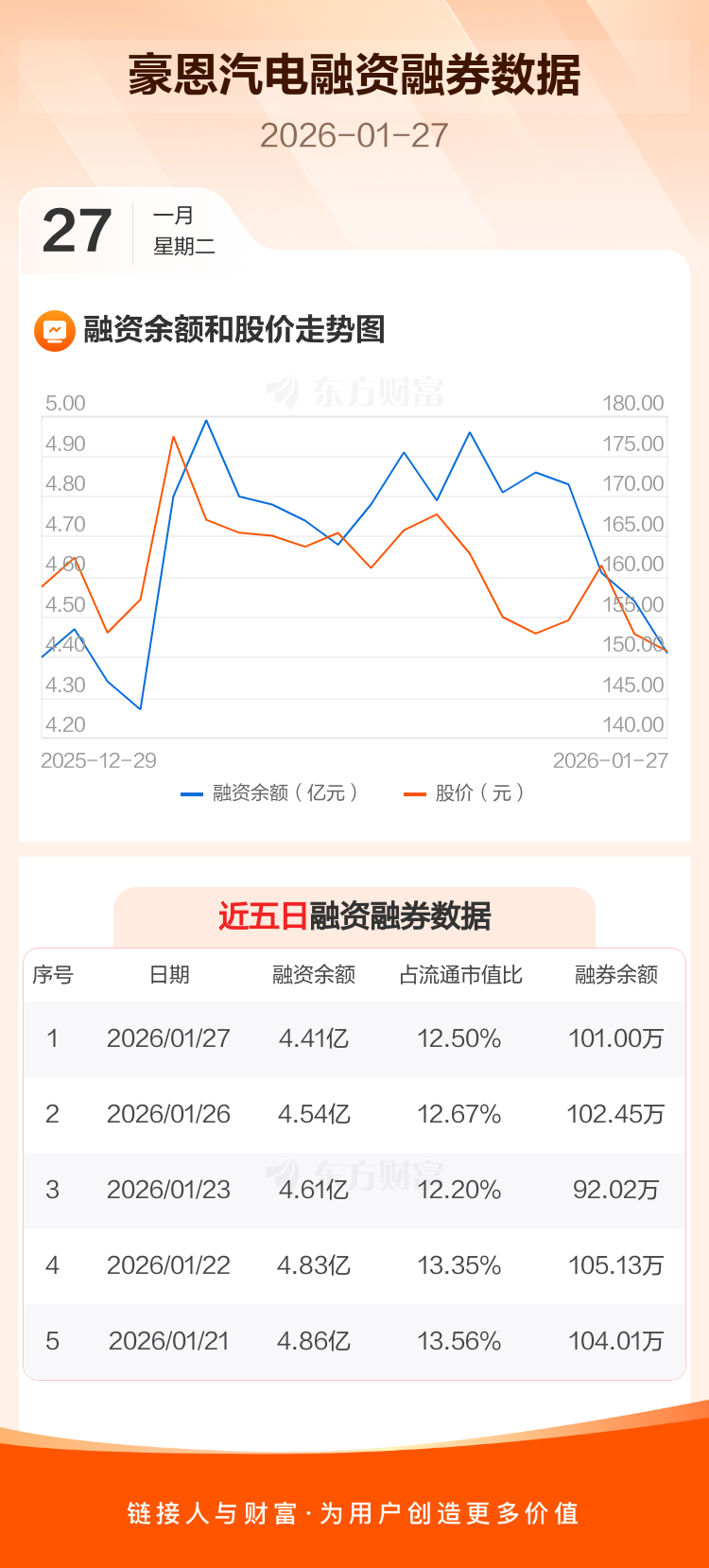 交易所最新数据显示,豪恩汽电于2026年1月27日获融资买入3190.66万元,融资偿还4427.81万元,当日融资净偿还1237.15万元。目前,该股融资余额4.41亿,占流通市值比例为12.50%。