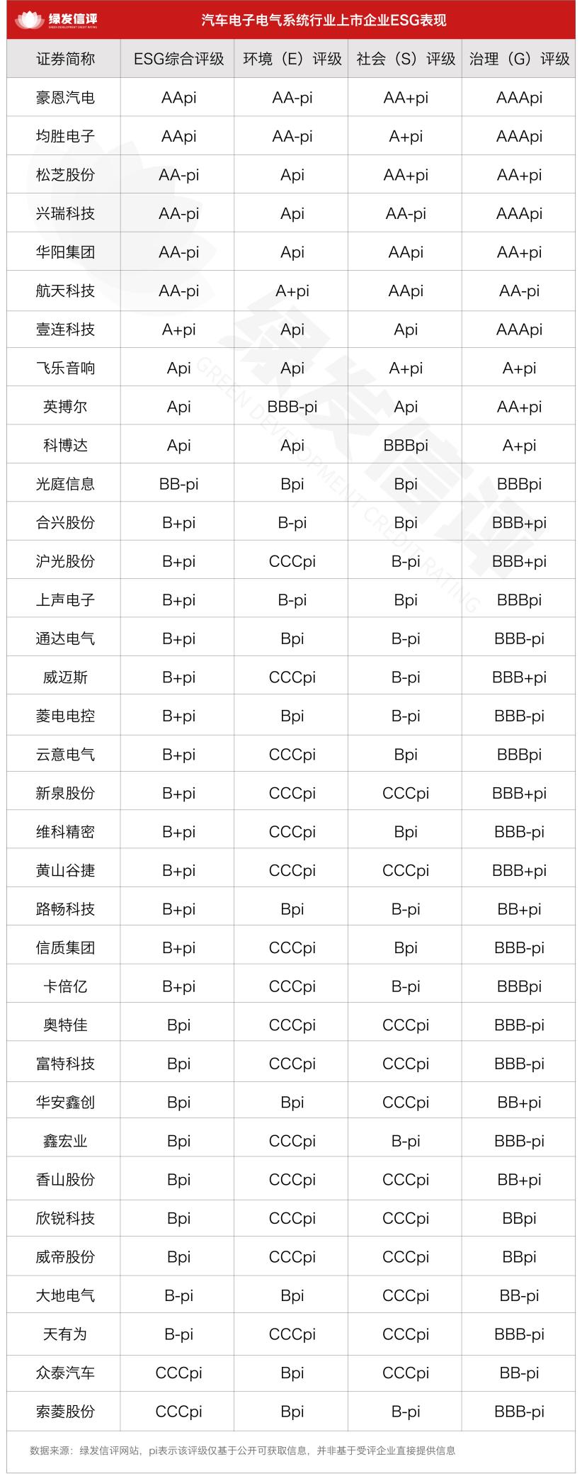 中国财富网讯全球汽车产业智能化、电动化转型浪潮下,汽车电子电气行业迎来发展新变局,作为智能驾驶的核心“神经中枢”,行业既需以智驾技术筑牢产业发展根基,更要以ESG发展理念锚定绿色转型方向。近日,海南绿色发展信用评级有限公司(以下简称“绿发信评”)发布A股上市公司ESG主动评级结果,汽车电子电气行业ESG发展水平呈现分化态势,豪恩汽电和均胜电子凭借环境、社会和治理各维度良好表现脱颖而出,成为行业以智驾赋能、以ESG驱动绿色转型的标杆,为行业高质量发展探索可行路径。