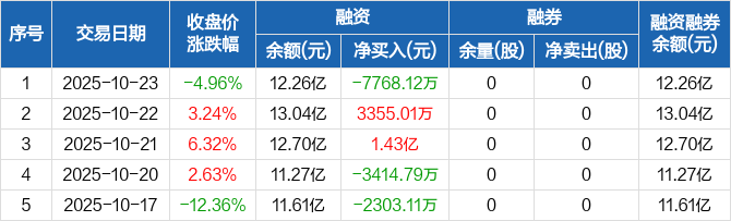 融资方面,当日融资买入1.07亿元,融资偿还1.84亿元,融资净偿还7768.12万元。融券方面,融券卖出0股,融券偿还0股,融券余量0股,融券余额0元。融资融券余额合计12.26亿元。