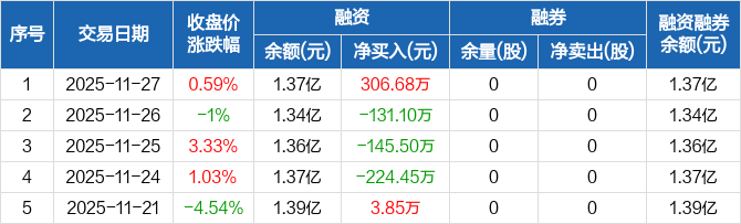 汉桑科技:融资净买入306.68万元,融资余额1.37亿元(11-27)