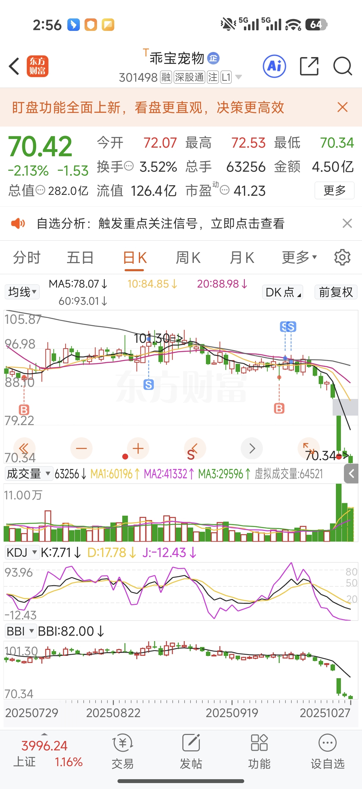 $乖宝宠物(SZ301498)$ 因为一直震荡不涨就给拍掉了,恰巧躲过一劫