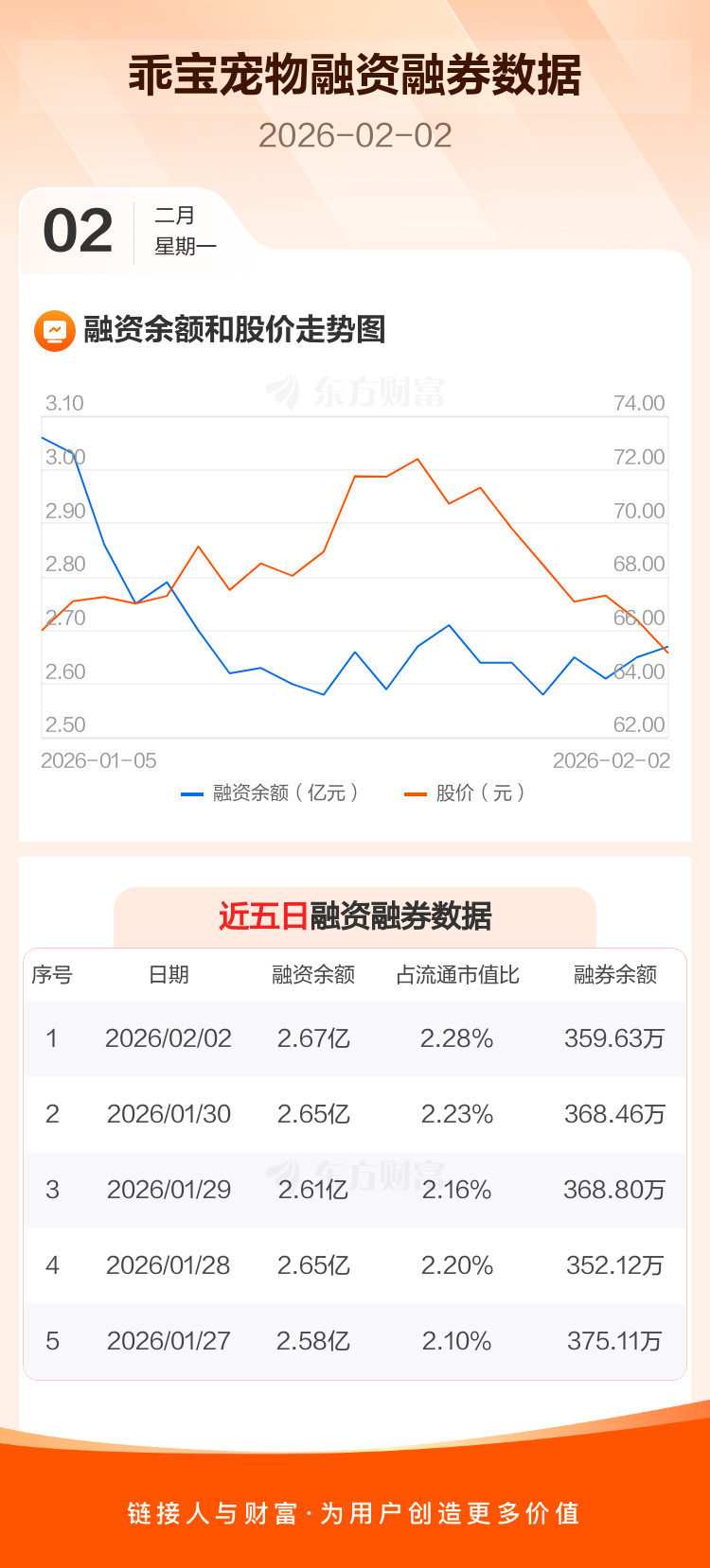 交易所最新数据显示,乖宝宠物于2026年2月2日获融资买入1423.41万元,融资偿还1305.80万元,当日融资净买入117.6万元。目前,该股融资余额2.67亿,占流通市值比例为2.28%。