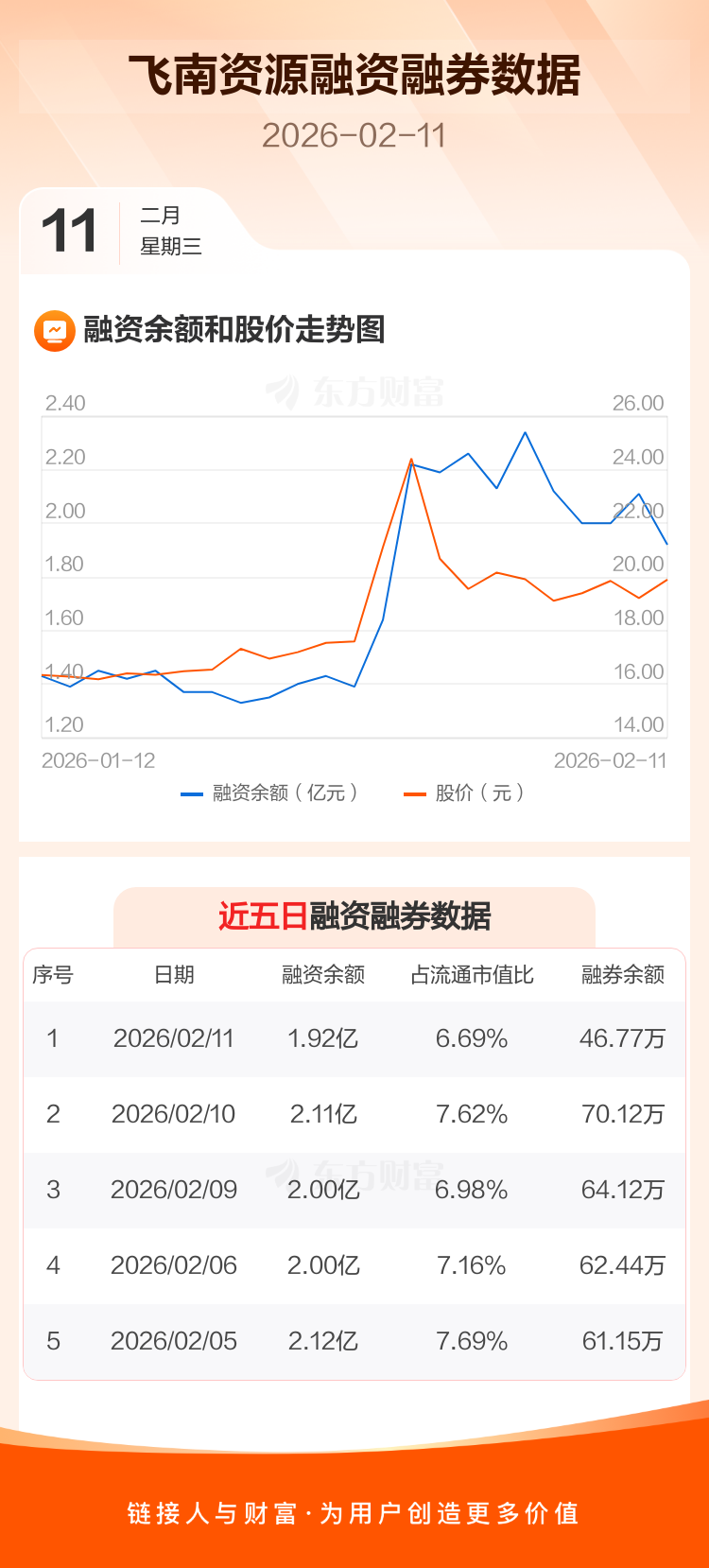 交易所最新数据显示,飞南资源于2026年2月11日获融资买入4000.31万元,融资偿还5913.16万元,当日融资净偿还1912.85万元。目前,该股融资余额1.92亿,占流通市值比例为6.69%。