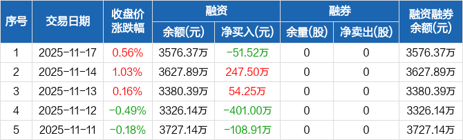 融资方面,当日融资买入275.56万元,融资偿还327.08万元,融资净偿还51.52万元。融券方面,融券卖出0股,融券偿还0股,融券余量0股,融券余额0元。融资融券余额合计3576.37万元。