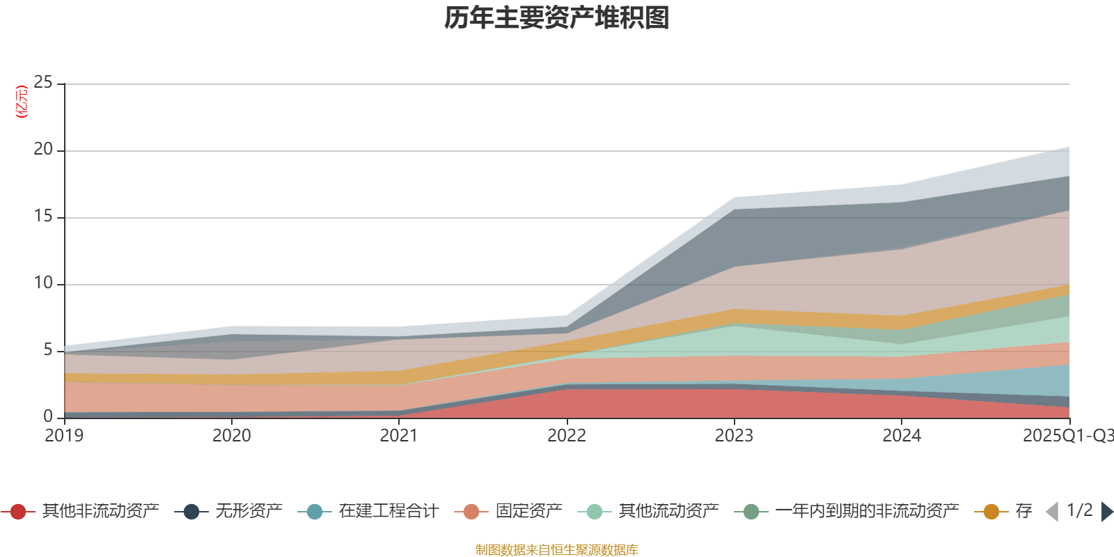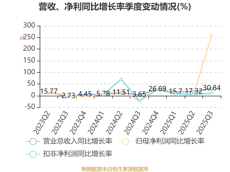 资产重大变化方面,截至2025年三季度末,公司货币资金较上年末减少25.21%,占公司总资产比重下降6.92个百分点;在建工程合计较上年末增加161.39%,占公司总资产比重上升6.54个百分点;其他非流动资产较上年末减少53.11%,占公司总资产比重下降5.64个百分点;其他流动资产较上年末增加107.02%,占公司总资产比重上升4.15个百分点。