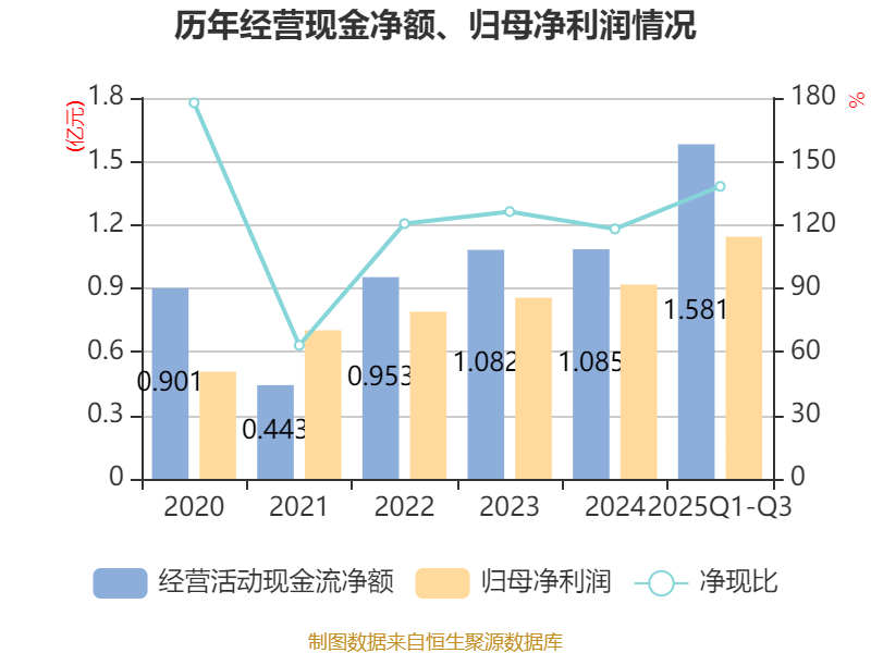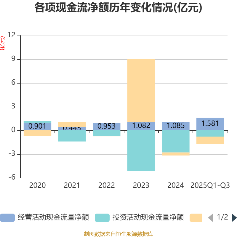 2025年前三季度,公司经营活动现金流净额为1.58亿元,同比增长56.52%;筹资活动现金流净额-9383.21万元,同比减少5715.23万元;投资活动现金流净额-7872.97万元,上年同期为-1.03亿元。