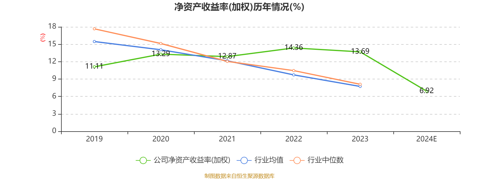 数据显示,2024年公司加权平均净资产收益率为6.92%,较上年同期下降6.77个百分点。