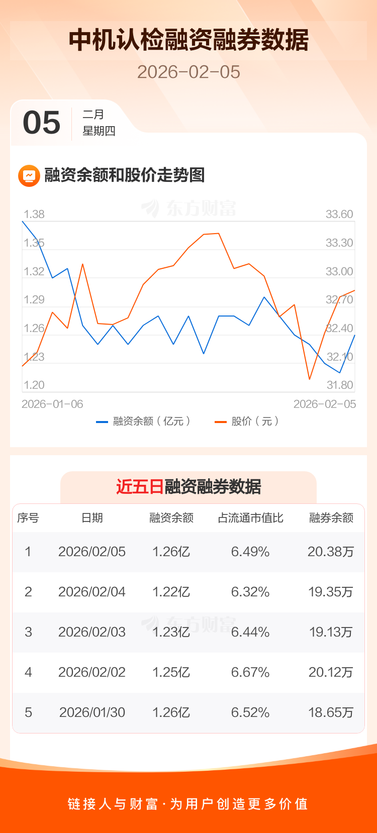 交易所最新数据显示,中机认检于2026年2月5日获融资买入637.42万元,融资偿还287.03万元,当日融资净买入350.39万元。目前,该股融资余额1.26亿,占流通市值比例为6.49%。