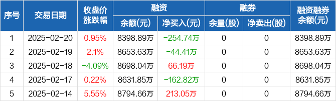 金凯生科:融资净偿还254.74万元,融资余额8398.89万元(02-20)