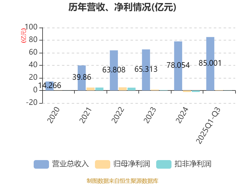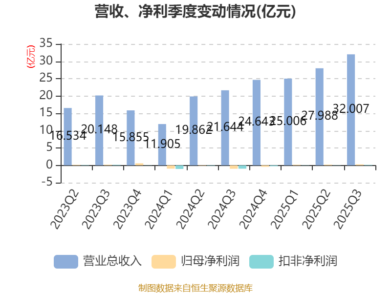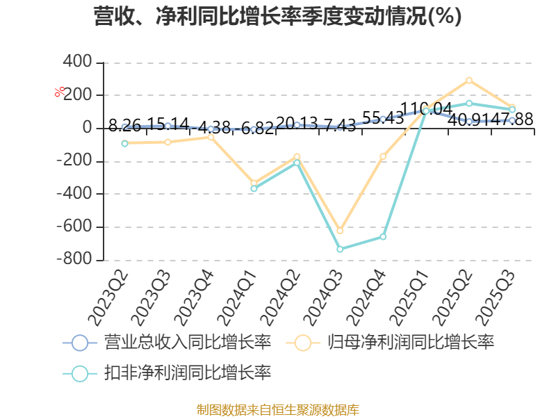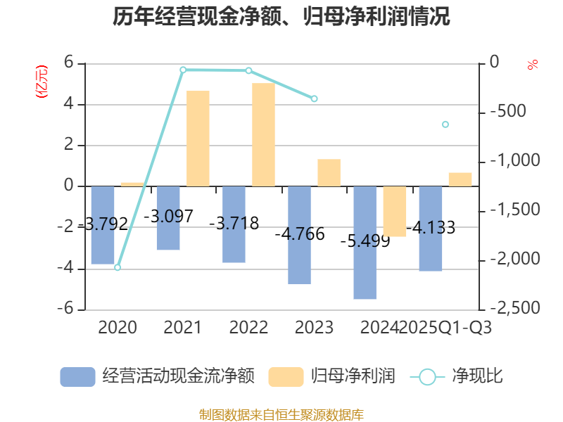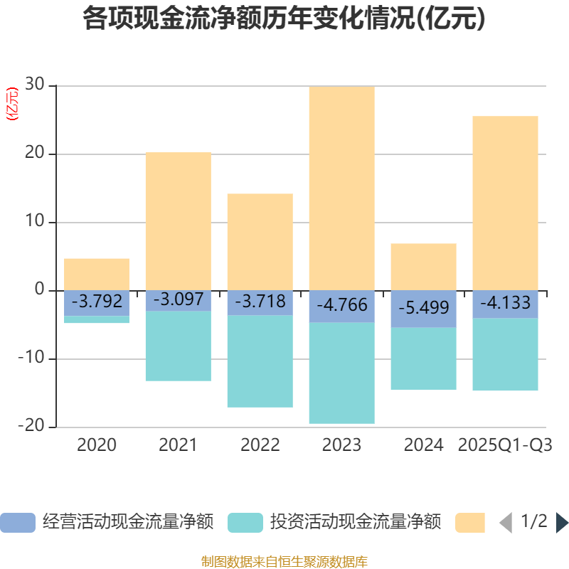 2025年前三季度,公司经营活动现金流净额为-4.13亿元,同比减少2.59亿元;筹资活动现金流净额25.5亿元,同比增加11.99亿元;投资活动现金流净额-10.57亿元,上年同期为-6.15亿元。