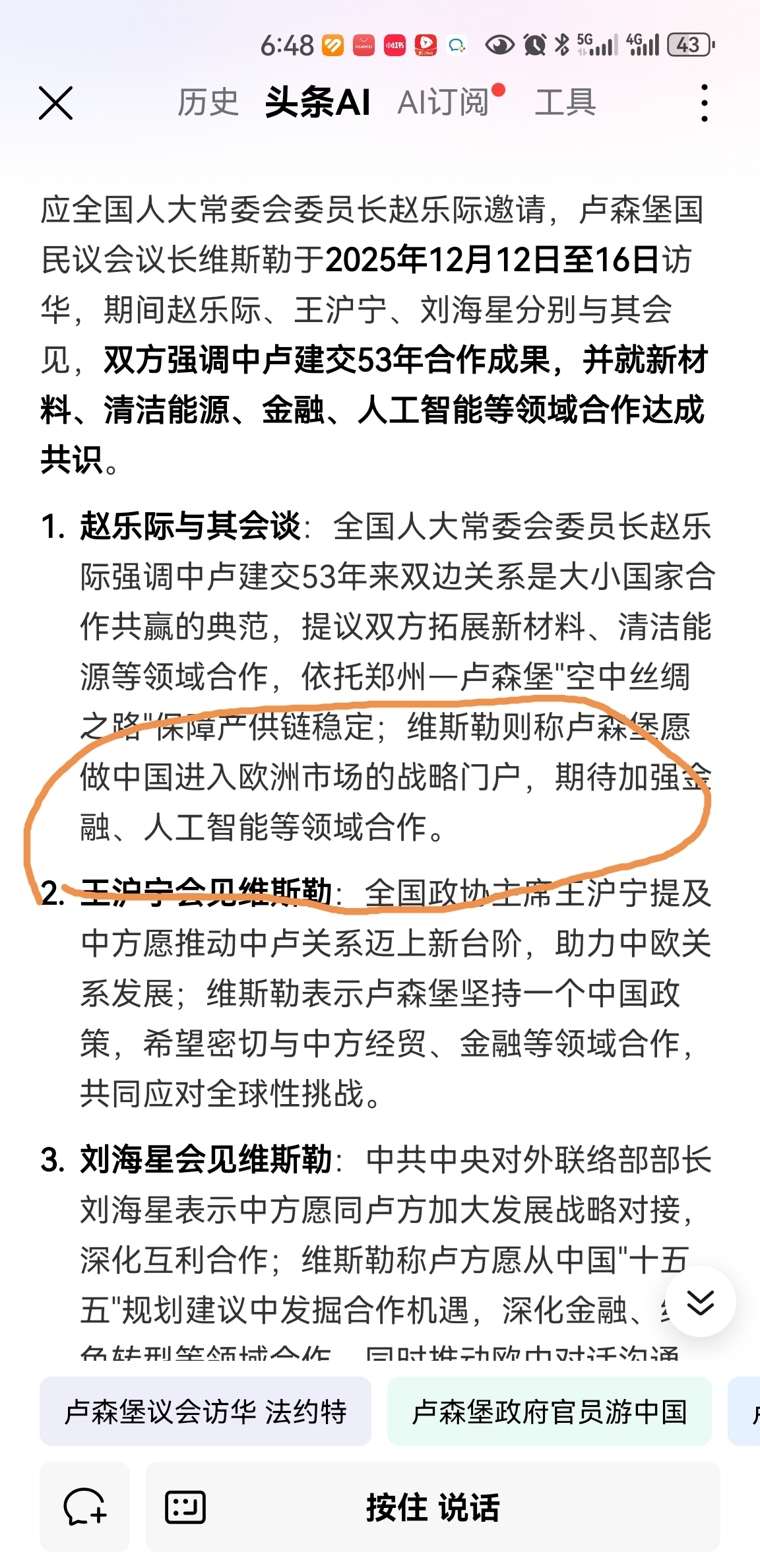 $德福科技(SZ301511)$ 维斯勒则称卢森堡愿做中国进入欧洲市场的战略门户,期待加强金融、人工智能等领域合作。