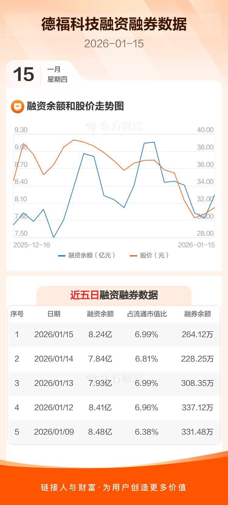 交易所最新数据显示,德福科技于2026年1月15日获融资买入1.27亿元,融资偿还8681.40万元,当日融资净买入4001.36万元。目前,该股融资余额8.24亿,占流通市值比例为6.99%。