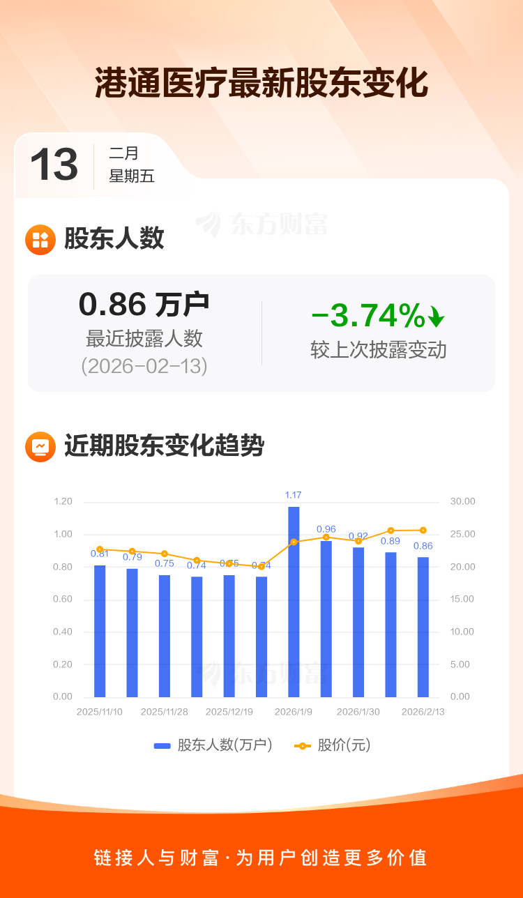 港通医疗最新披露数据显示,截至2月13日公司股东户数为8585户,较上期(2026年2月10日)减少334户,降幅为3.74%。户均持有流通股数量由上期的7351股上升至7637股,户均持股金额由上期的18.84万元增加至19.59万元。