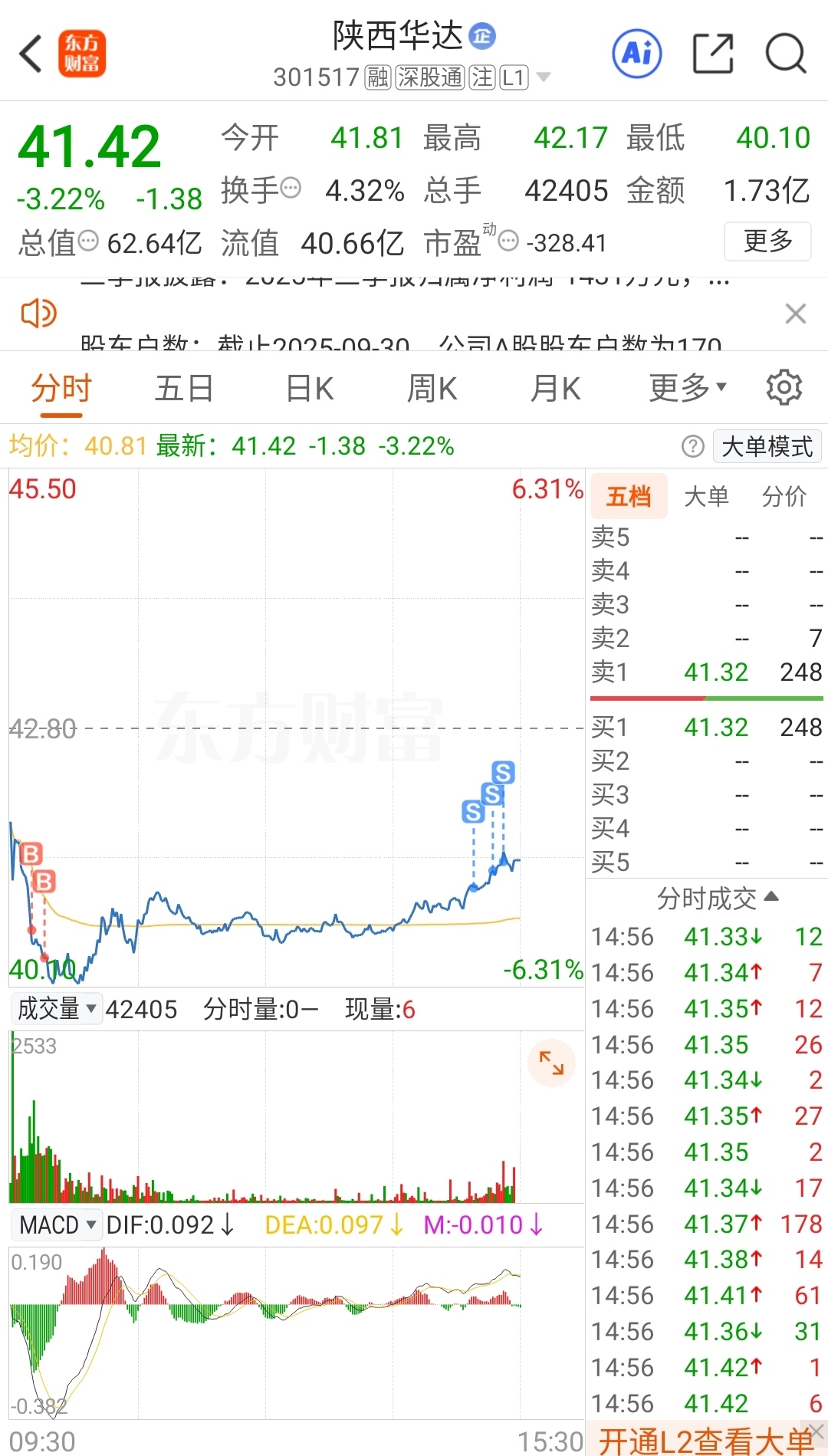 $陕西华达(SZ301517)$ 感谢主力,买了两笔,卖出三笔,周五逢低把卖的一部分再买回来