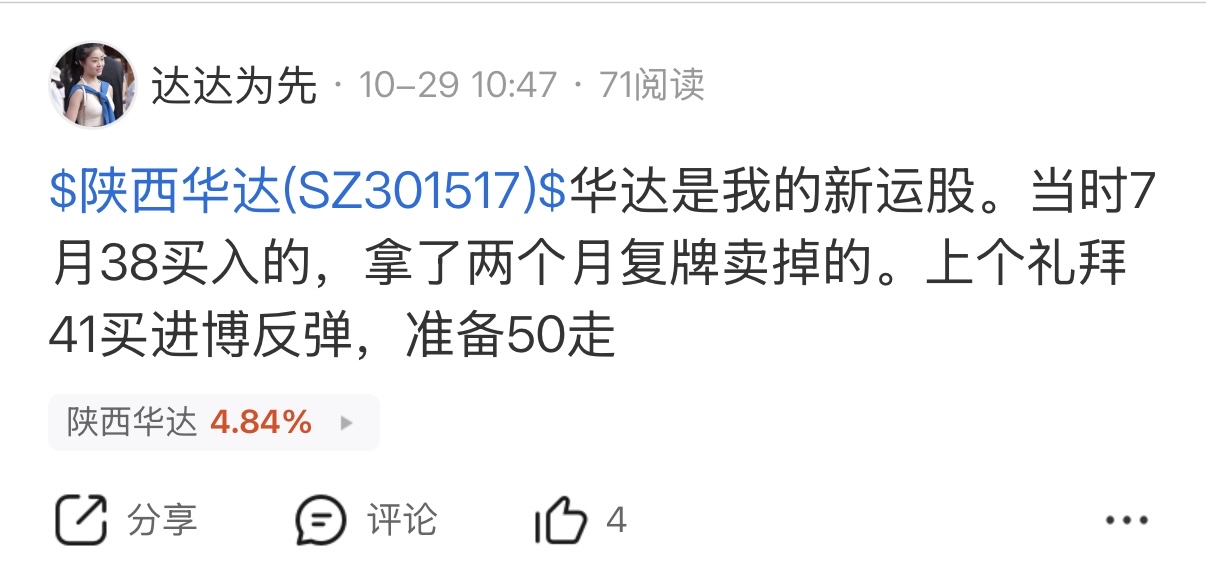 $陕西华达(SZ301517)$ 和我的幸运股告一段落,下次再来