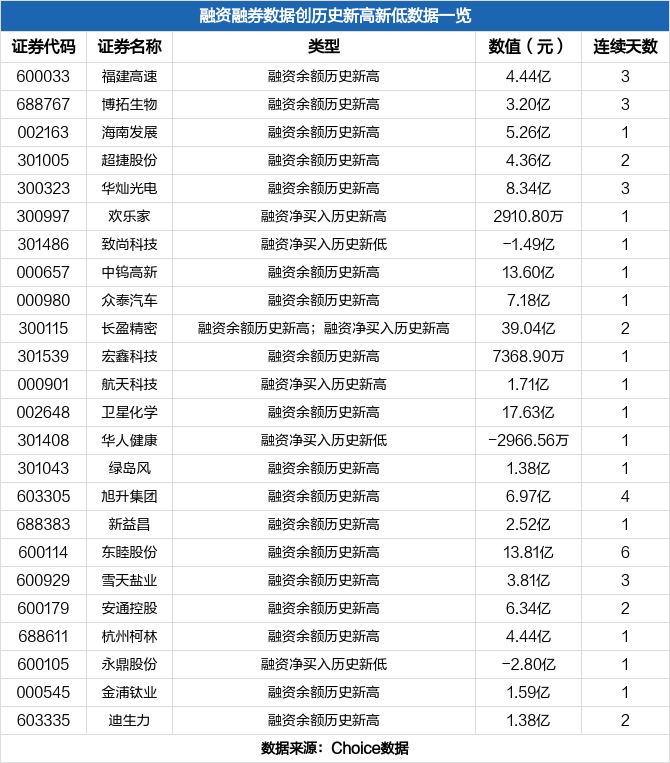 12月9日沪深两市共有108只股票两融数据创历史新高/新低,部分数据如下: