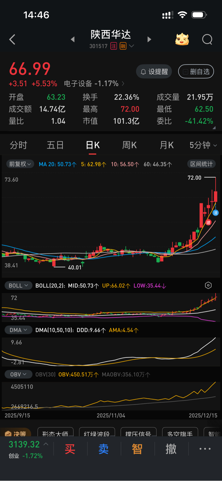 $陕西华达(SZ301517)$ 既然下午回调,有8个点先落袋收了,明天看开盘情况再考虑吧