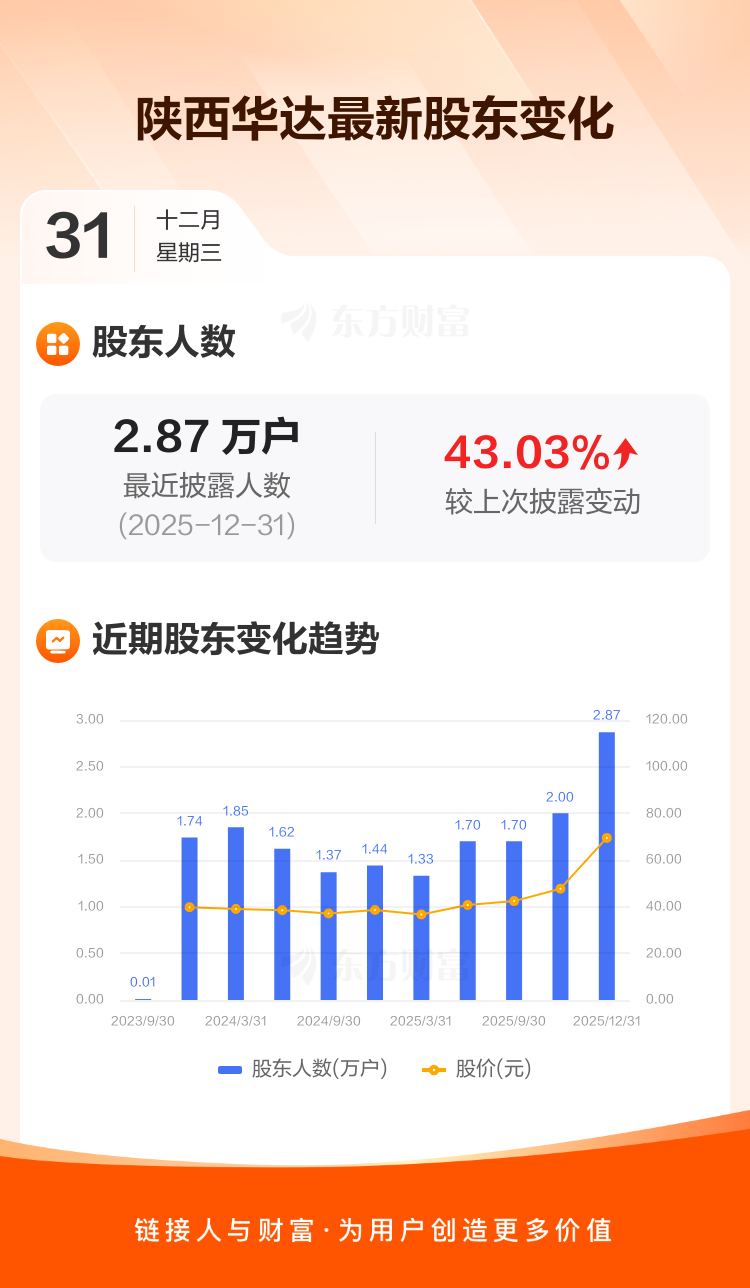 陕西华达:截至12月31日最新股东户数2.87万户,较上期增加43.03%