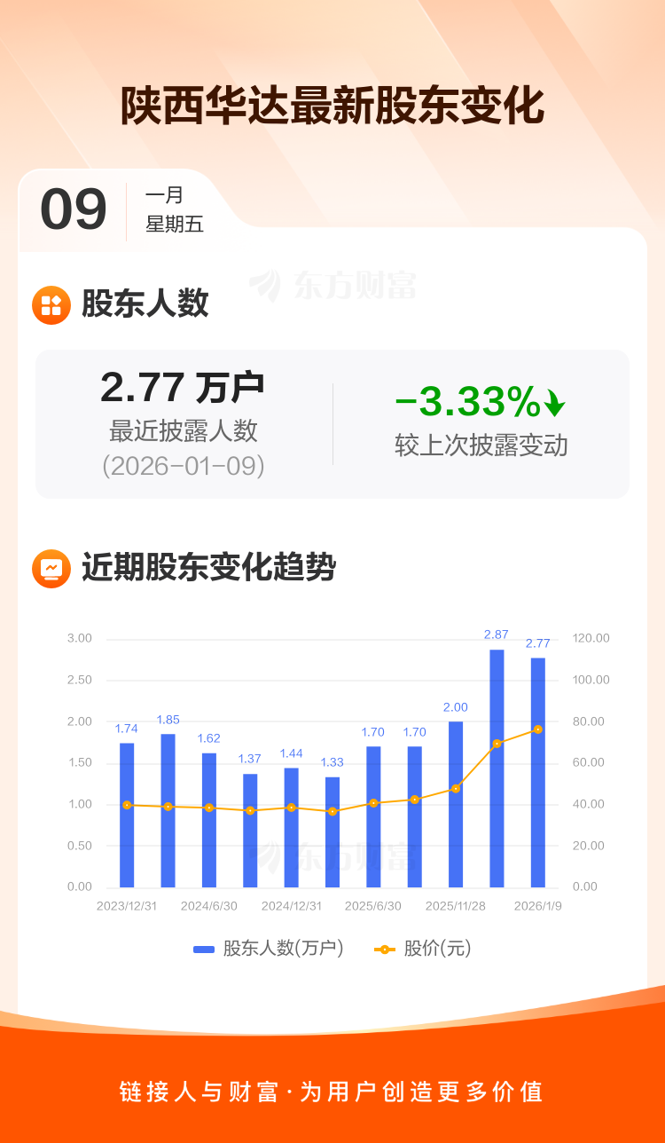 陕西华达:截至1月9日最新股东户数2.77万户,较上期减少3.33%