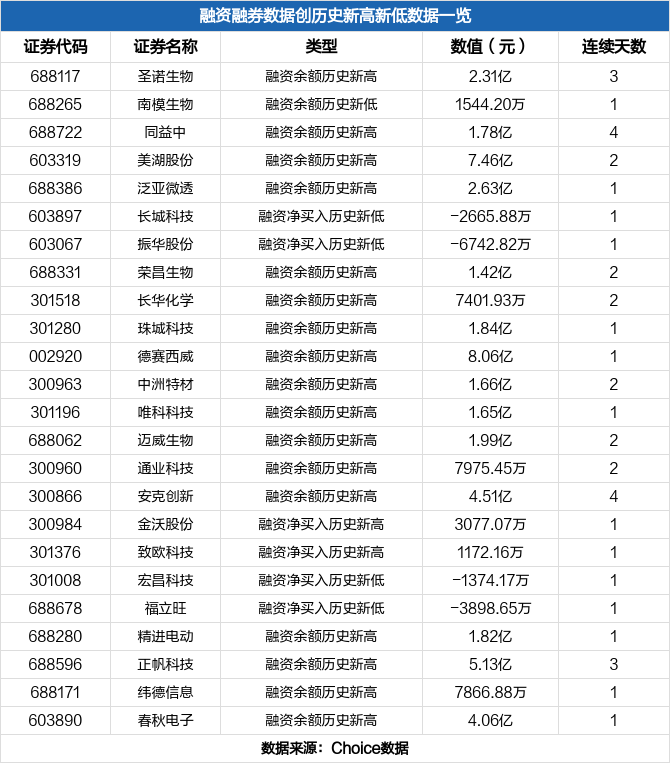 5月13日沪深两市共有59只股票两融数据创历史新高/新低,部分数据如下: