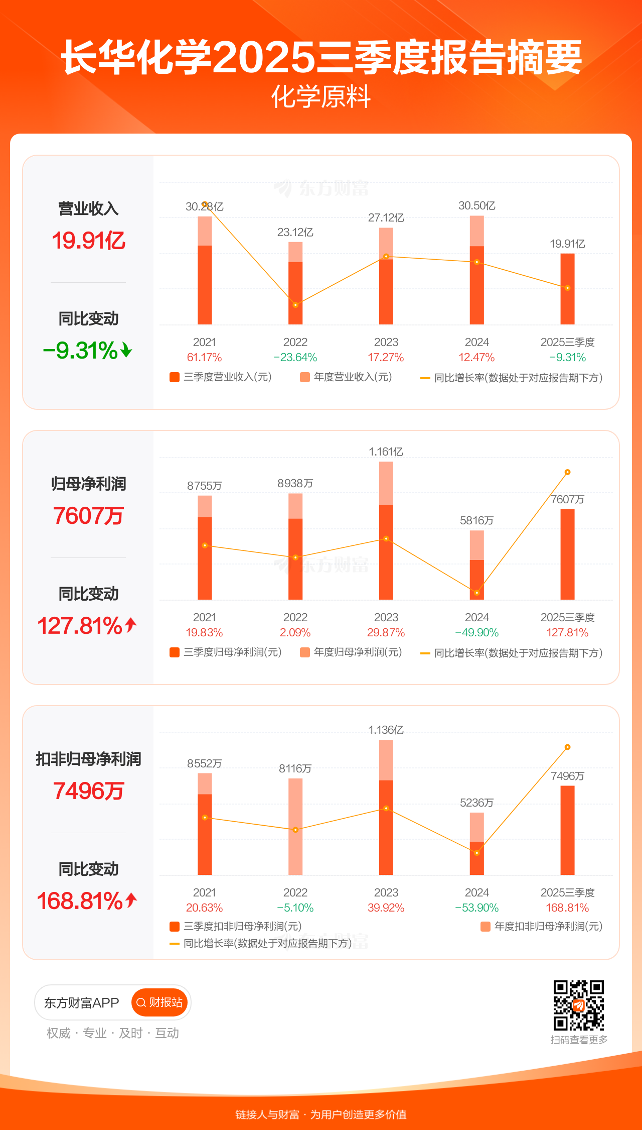 长华化学10月29日发布2025年三季报显示,公司前三季实现营业收入19.91亿元,同比下滑9.31%;归母净利润7606.70万元,同比增长127.81%;扣非归母净利润7495.80万元,同比增长168.81%。