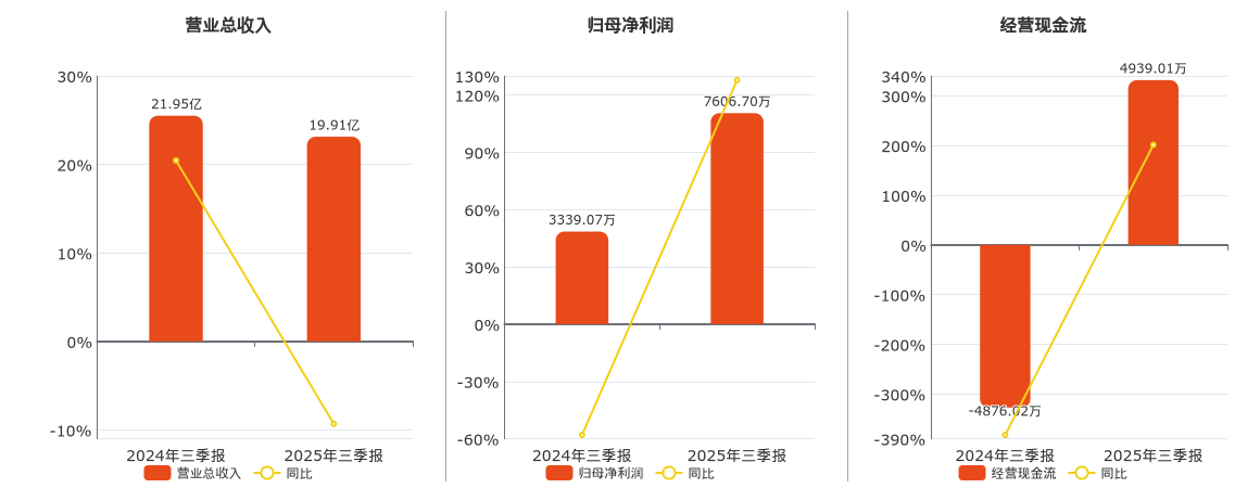 公司营业总收入为19.91亿元,较去年同报告期营业总收入减少2.04亿元,同比较去年同期下降9.31%。归母净利润为7606.70万元,在已披露的同业公司中排名第63。经营活动现金净流入为4939.01万元,在已披露的同业公司中排名第72。