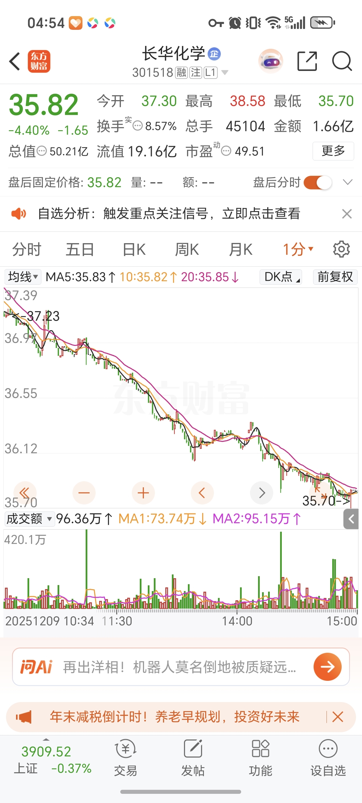 $长华化学(SZ301518)$ 一分钟K线,持续出货,没有一丝反弹,出什么问题了吗