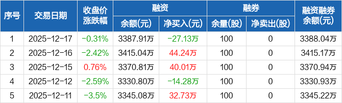 舜禹股份:融资净偿还27.13万元,融资余额3387.91万元(12-17)