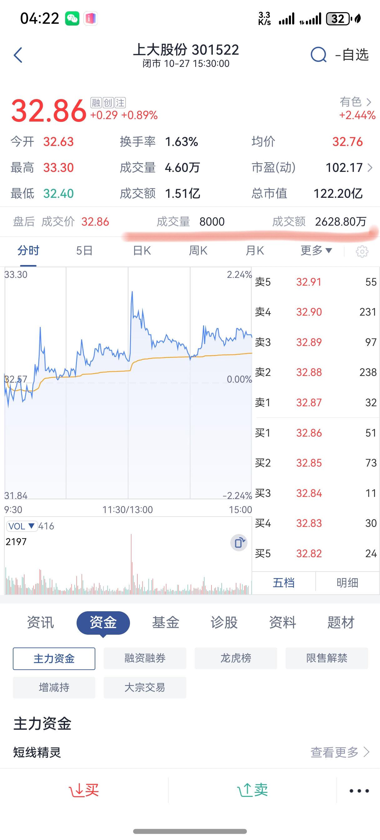 $上大股份(SZ301522)$ 22号协议接盘拉高股价,23号流出4123.13万,然后尾盘八千手接盘,24号流出2289.85万,尾盘继续八千手接盘,27号今天流出1726.08万,尾盘八千手继续接盘,按今天32.86*8000=2628.80万,散户们自己好好看看尾盘八千手接盘的,第二天出的货是不是差不多出完了?