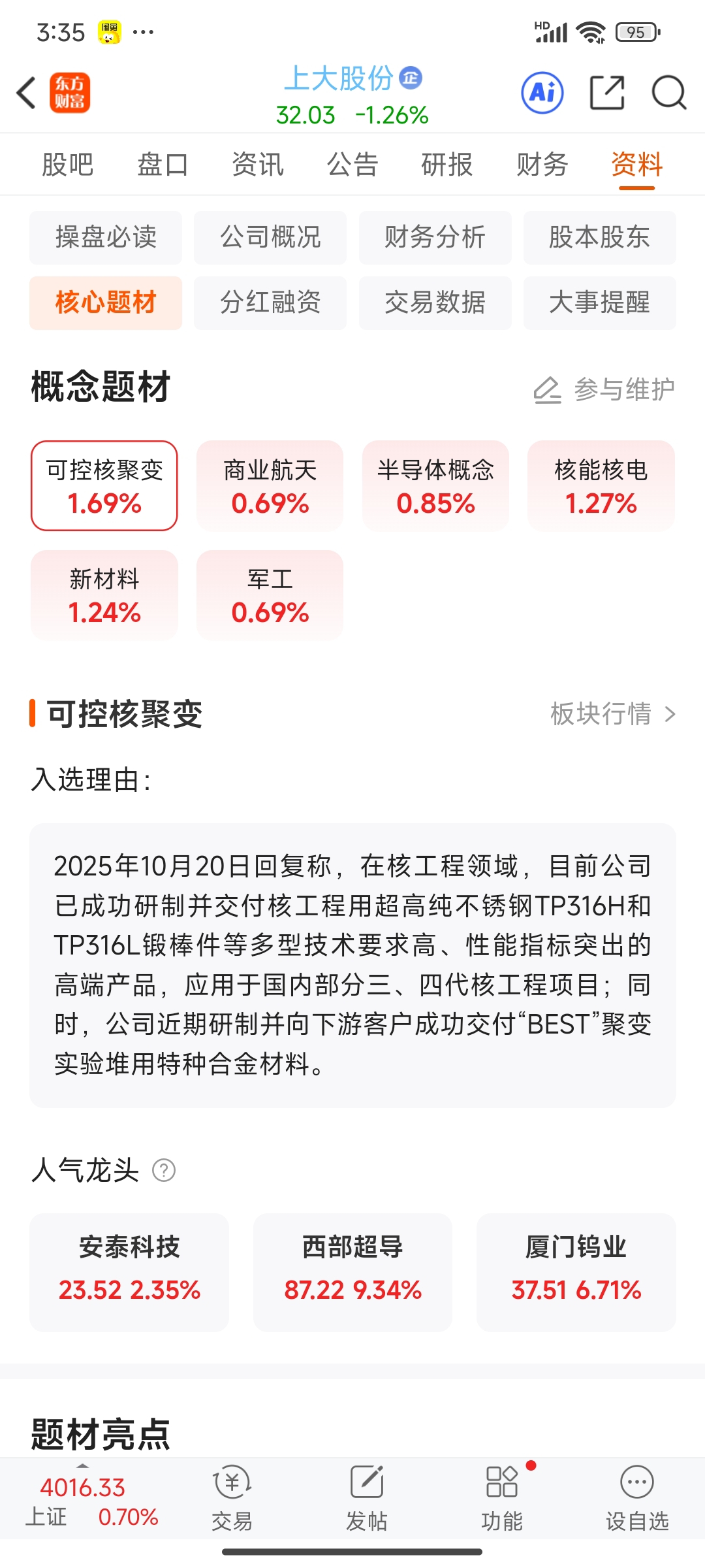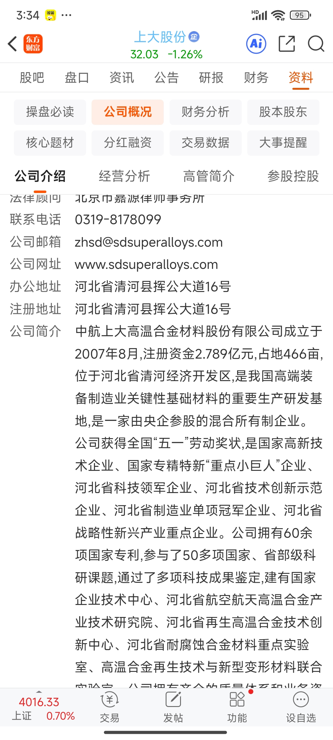 $上大股份(SZ301522)$ 这个票标准的新材料公司。可以说是特种合金材料的顶级龙头。120亿市值绝对低估了。耐高温材料这3个字很重要,我就真不信你能使劲砸盘。好东西都会虎视眈眈的。陆续买进,请继续砸盘我还得低价进货