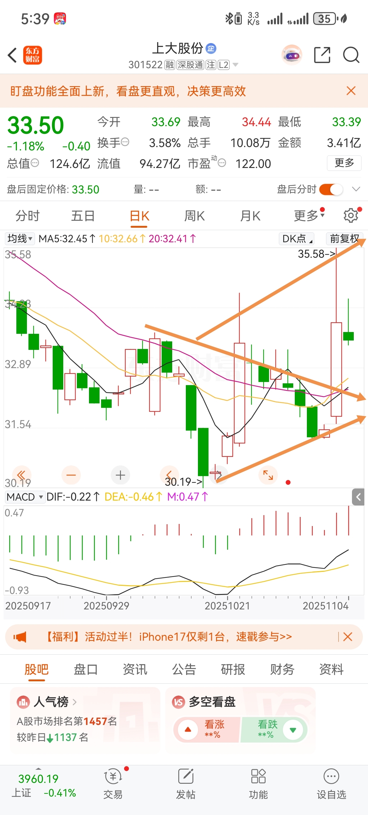 $上大股份(SZ301522)$ 盘面操控有一定水平,前面跑了1.6亿,昨天二千万拉了七个点,量价不匹配,大多买的多是散户,今天缩量下跌,几次冲高都被故意砸下来了。