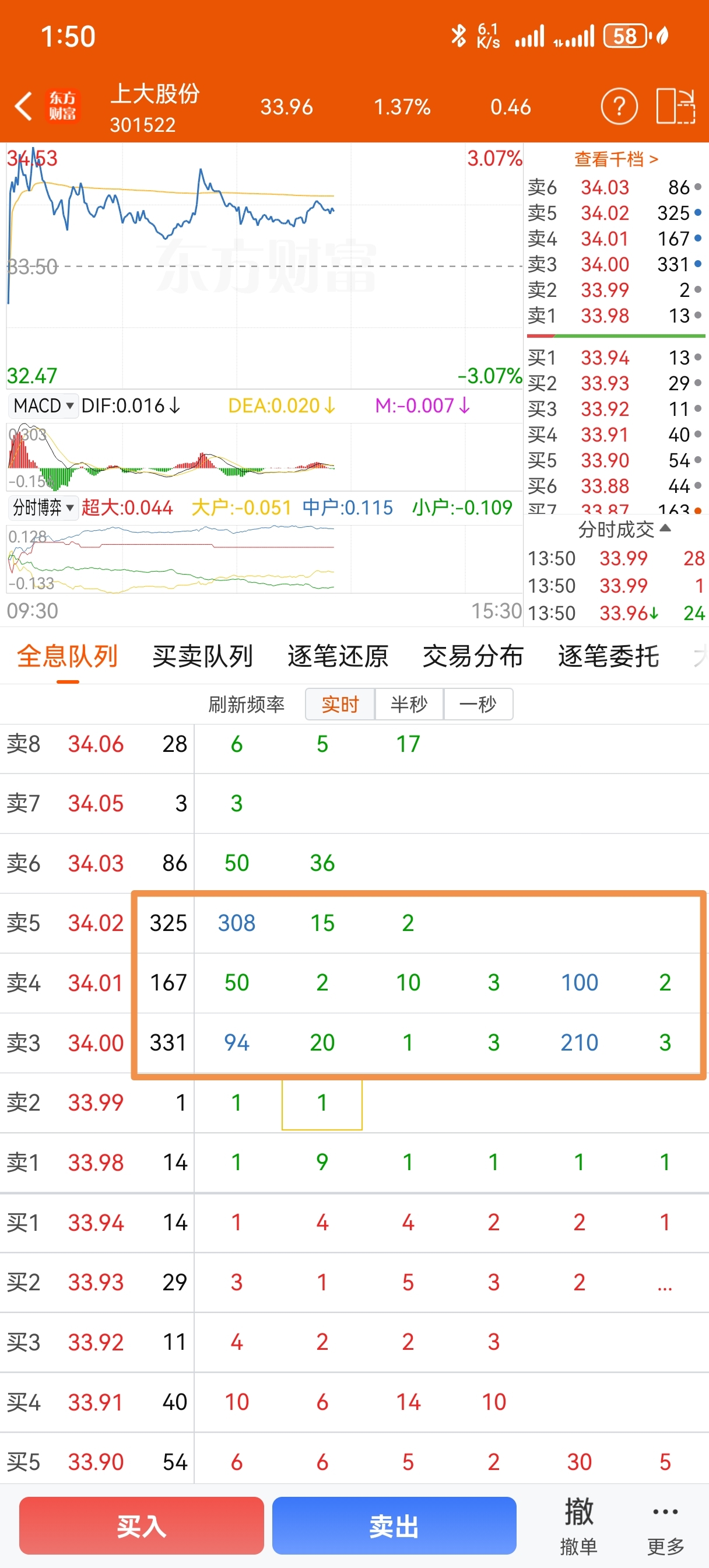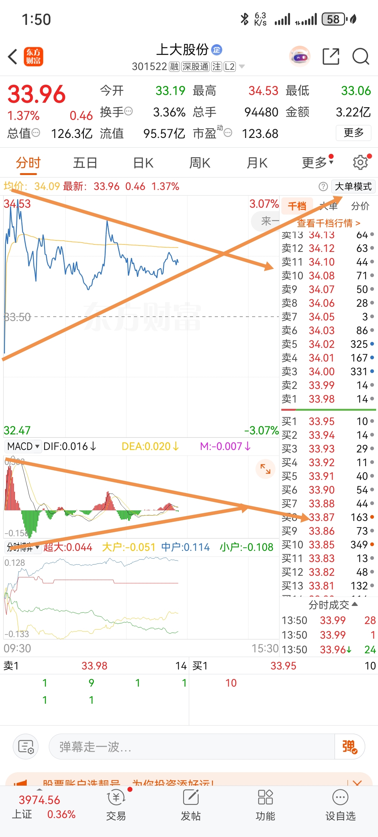 $上大股份(SZ301522)$ 大盘拉红了,这个股早盘冲高回落,天天冲高回落,一根长长的上影线,34一堆压单,砸盘的,全是散户买入,根本上不去,外面大把涨停的,还拿这个唱多的散户都是被套的,macd日线拉这么长,股价没变化,量价不匹配还要下跌。
