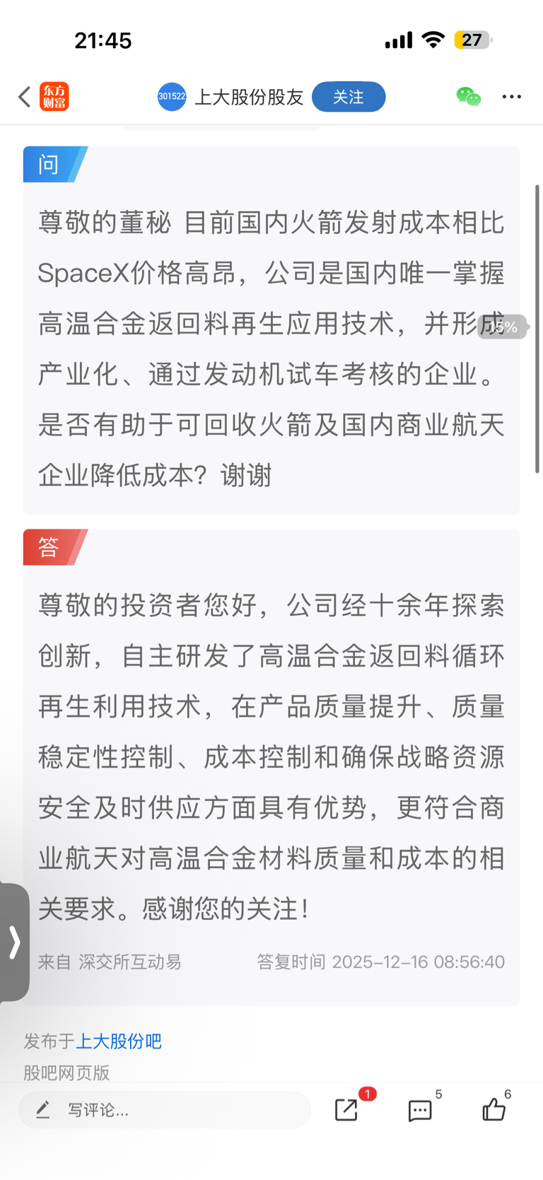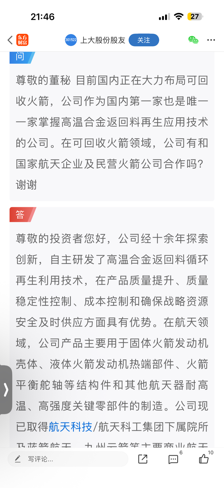$上大股份(SZ301522)$ 中国火箭可回收第一股
