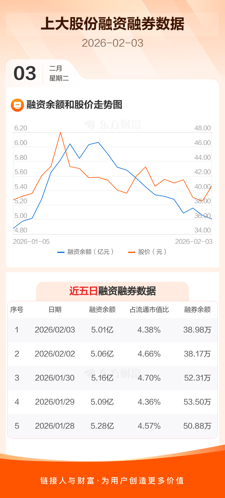交易所最新数据显示,上大股份于2026年2月3日获融资买入4511.18万元,融资偿还5056.69万元,当日融资净偿还545.51万元。目前,该股融资余额5.01亿,占流通市值比例为4.38%。