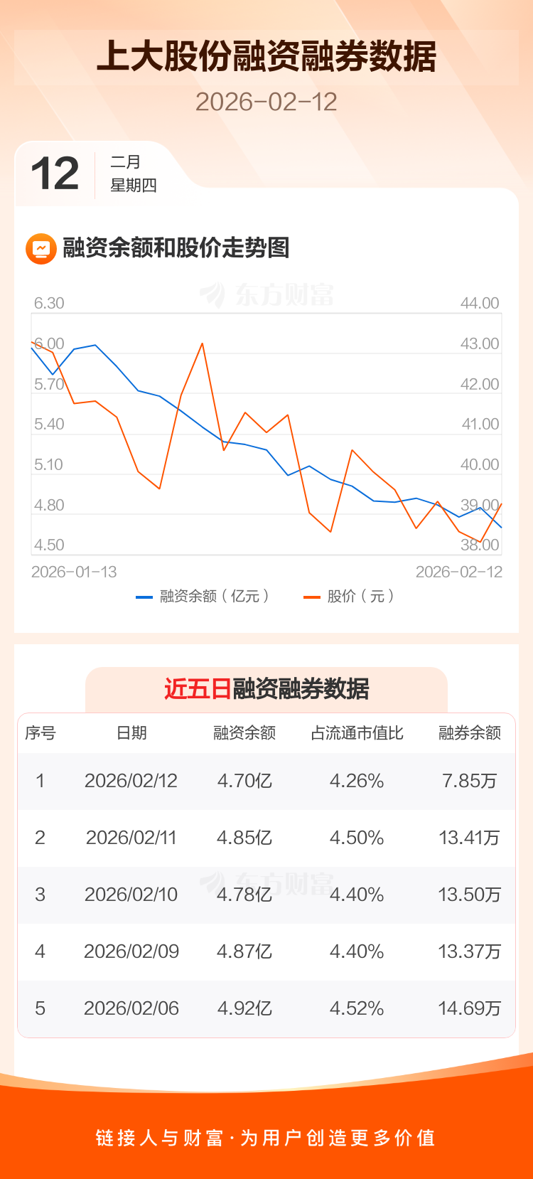 交易所最新数据显示,上大股份于2026年2月12日获融资买入3303.57万元,融资偿还4776.00万元,当日融资净偿还1472.42万元。目前,该股融资余额4.70亿,占流通市值比例为4.26%。