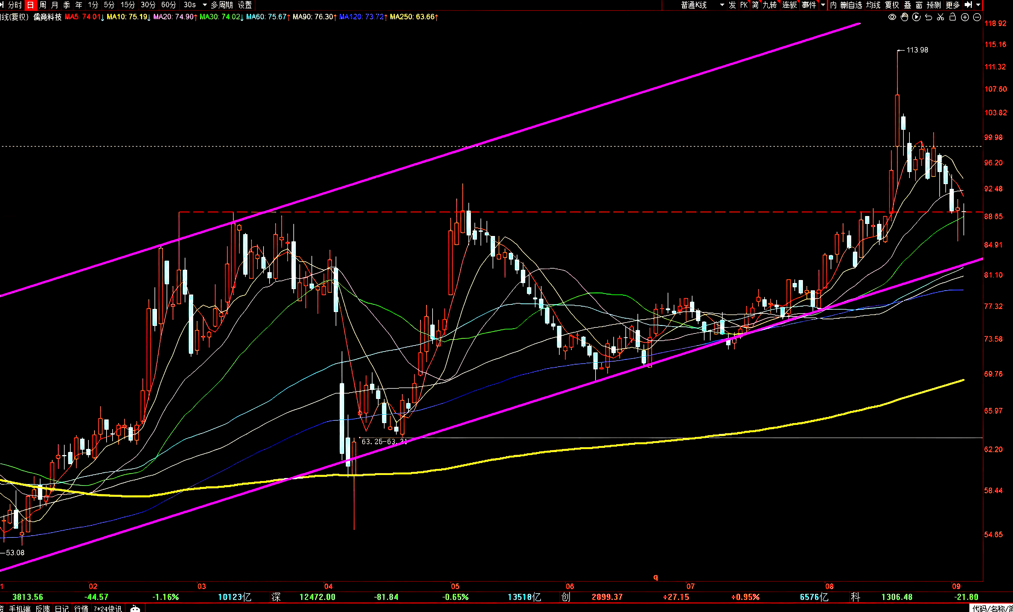最近的这波下跌是对6月10日低点68.99到8月19日高点113.98上升浪的回调,前天和昨天的“双针急探”也是对2月至5月多重顶的回踩确认,双针作空头陷阱的意味十分浓厚!!留待验证,对与不对今天起两个交易日内即可见分晓。股价再次放量上行时记得及时上车哦