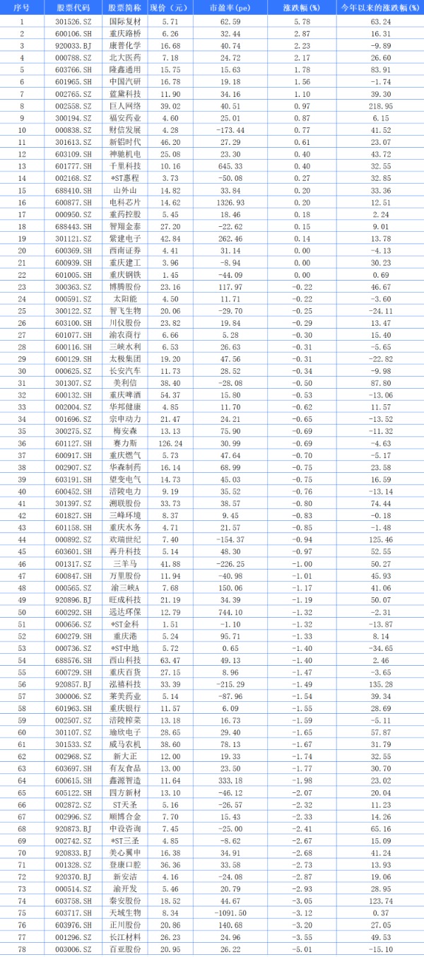 12月4日,78家重庆A股上市公司中有19家上涨。