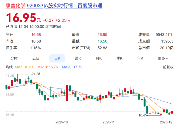 康普化学2025年前三季度营业收入1.75亿元,同比下降38.57%,归母净利润3717.2万元,同比下降53.10%,扣非后归母净利润3023.56万元,同比下降61.28%。