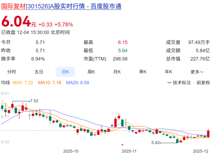 国际复材报收6.04元,日涨幅5.78%,列第一,换手率6.94%,今年以来的涨幅为63.24%。