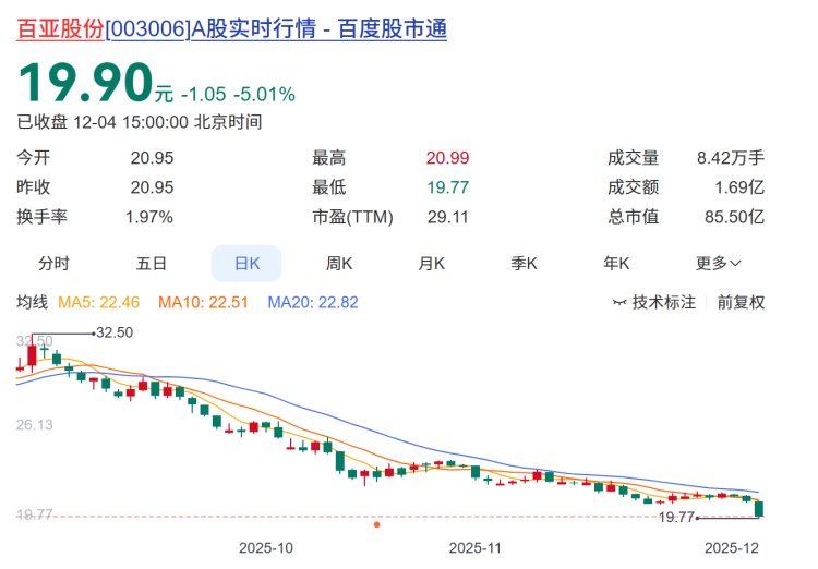 百亚股份报收19.90元,日涨幅-5.01%,换手率1.97%,今年以来的涨幅为-15.10%。