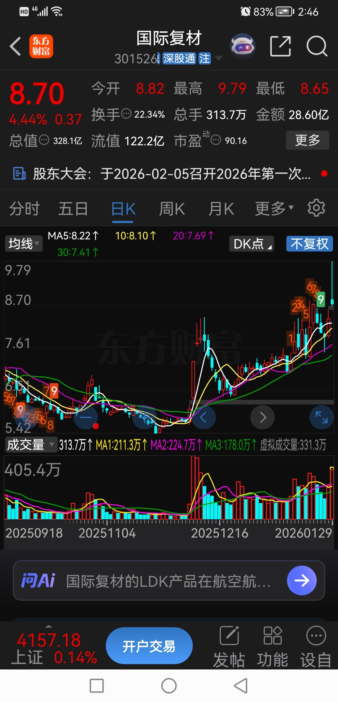 $国际复材(SZ301526)$ 明天看看吧,看谁走得快。