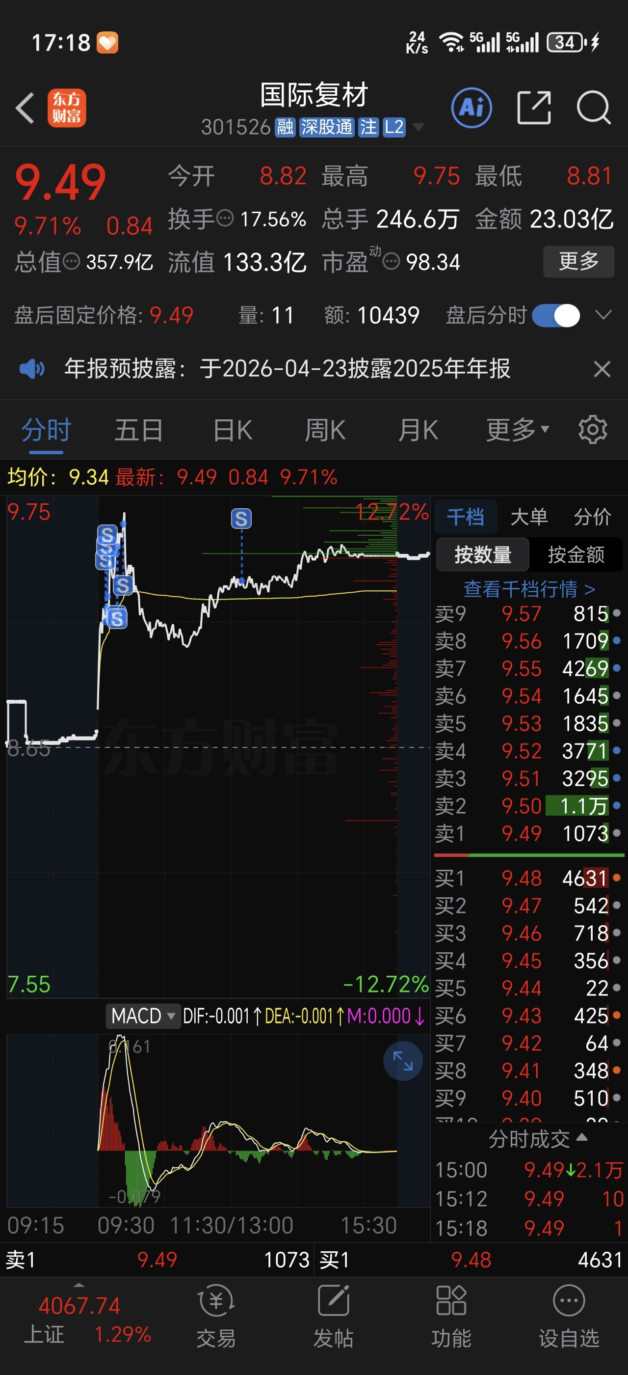 $国际复材(SZ301526)$ 上午减仓了95%,下午看涨得太费劲走人了